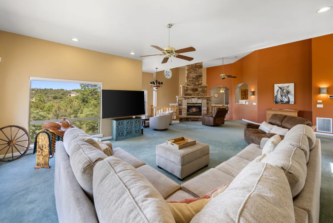 This custom home was built with attention to detail. When you enter through the front door to the open entry you are greeted by a two-story stone fireplace and a sweeping staircase that takes you to the main living area. It’s hard to choose between hanging in front of the fireplace, looking out from a cozy seating area, or sitting back and enjoying a good movie or game on the large screen t.v. Venture over to the large dining area with high vaulted ceilings and enjoy a photo op on the saddle on the way to the kitchen. Great kitchen with open cook-top, double oven, microwave, sit-down eating area, walk-in pantry, archway views back to the living room and access to patios facing the views to the front or the back. Don’t worry if you don’t want to cook, there are several great nearby restaurants to visit or order to-go. On the same floor, the Primary Bedroom is a retreat within the retreat, complete with a Cal-King bed, fireplace, TV, relaxing seating to once again take in the views. Spacious attached bathroom with double vanity, spa tub, separate shower, private water closet. Walk-in closet. Don’t miss the office which even if you don’t have to work, has some of the best views. On a clear day, you can see San Francisco Peak from there. Large Laundry Room and Guest Bath completes the rooms on this living level. Another flight of stairs takes you to the two other bedrooms and a full bathroom downstairs. One bedroom has a set of twin bunks and a set of full bunks. There is also an armoire with a TV. The adjacent alcove has access to the back driveway and steps up to the back patio. The other bedroom has a Cal-King bed, walk-in closet, with access to a private sitting area outside, which then leads to the front of the house.